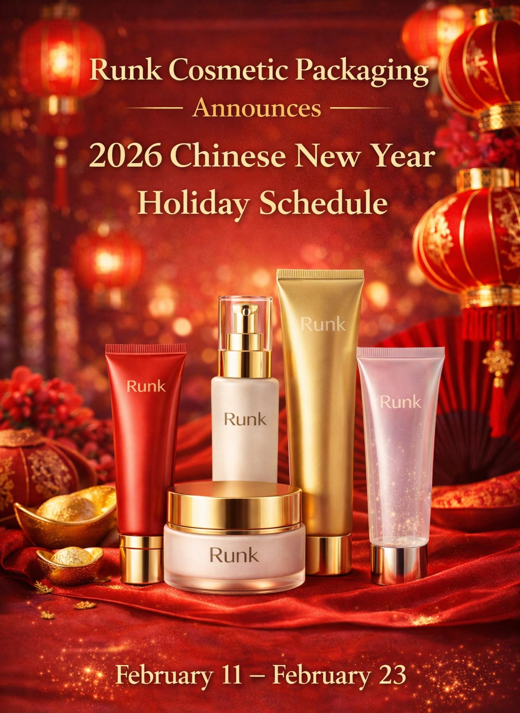 Косметическая упаковка RunkКомпания, ведущий производитель инновационных решений в области упаковки косметической продукции, сегодня объявила о своем графике праздничных продаж в связи с праздничными мероприятиями. Китайский Новый год. Компания приостановит свою деятельность с С 11 по 23 февраля 2026 годаэто позволит сотрудникам воссоединиться с семьями и отпраздновать наступление Года Лошади.